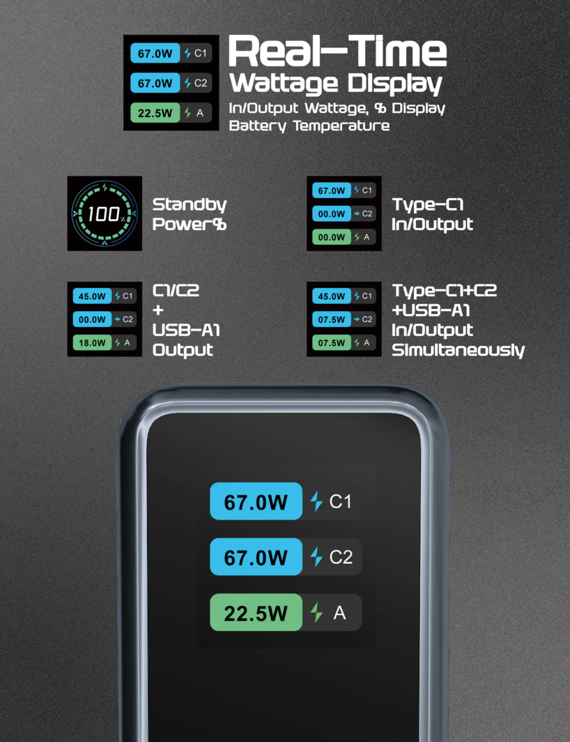 Type-C 和有線輸出:5V~15V/3A,20V/3.35A (67W)
